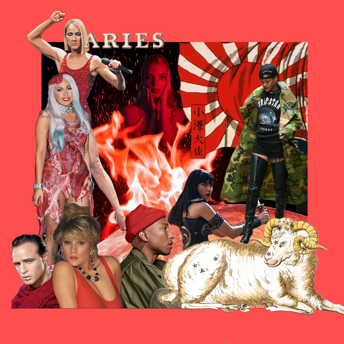 - Rihanna, who although is a Pisces, may in fact have Aries Rising, and the Moon, Venus and Jupiter in Aries. Seen above with her camo coat on, a true boss energy is in her stance.