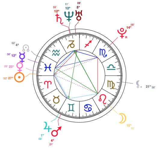 Although Phil Collins is an Aquarius (see his birth chart here), he has Mars, Jupiter and the North Node in Pisces (her Venus is conjunct his North Node, her North Node conjunct his Mars). Her Moon lands on his Pluto…