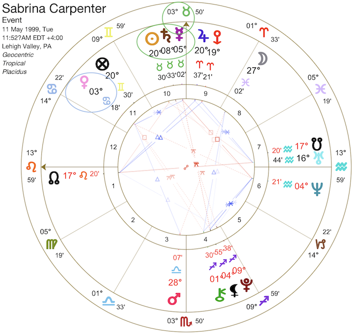 Firstly, Carpenter is such a good name for an earthy Taurus. I love to see this association with wood, regardless of her rising sign. Her Sun, Mercury, Saturn and possibly the Midheaven appear in this fixed sign. With the 11:52 am time, Mercury in musical Taurus is conjunct the Midheaven (the point of career and calling).