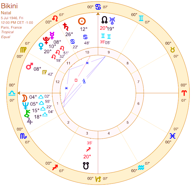 As you can see from the horoscope above, the bikini was launched under a Cancer sun, Libra moon (conjunct dreamy Neptune, god of the seas), with Venus in showy Leo.