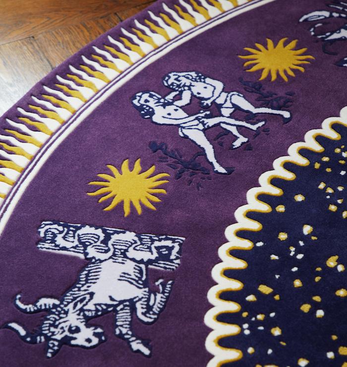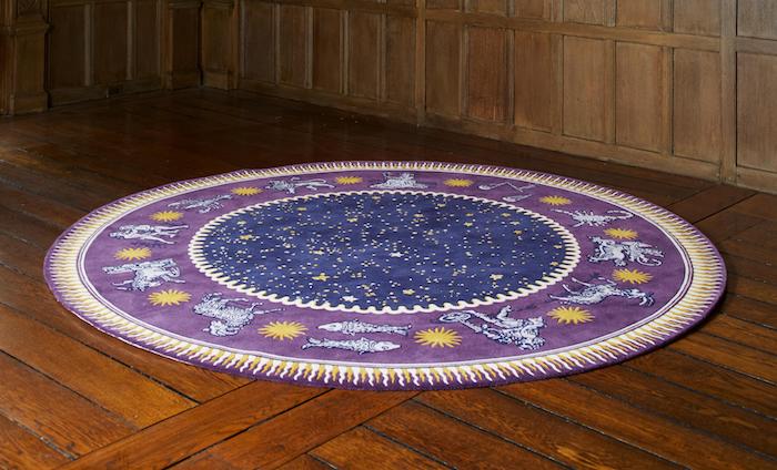 The zodiac rug takes about 6 to 7 weeks production time, a 8 ft (243.84 cm) piece with astrological motifs running around a midnight sky.
